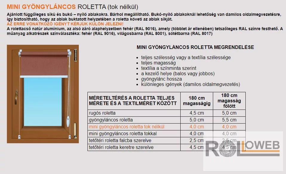 A Fóliával készülő roletta maximális textil szélessége 152 cm lehet!